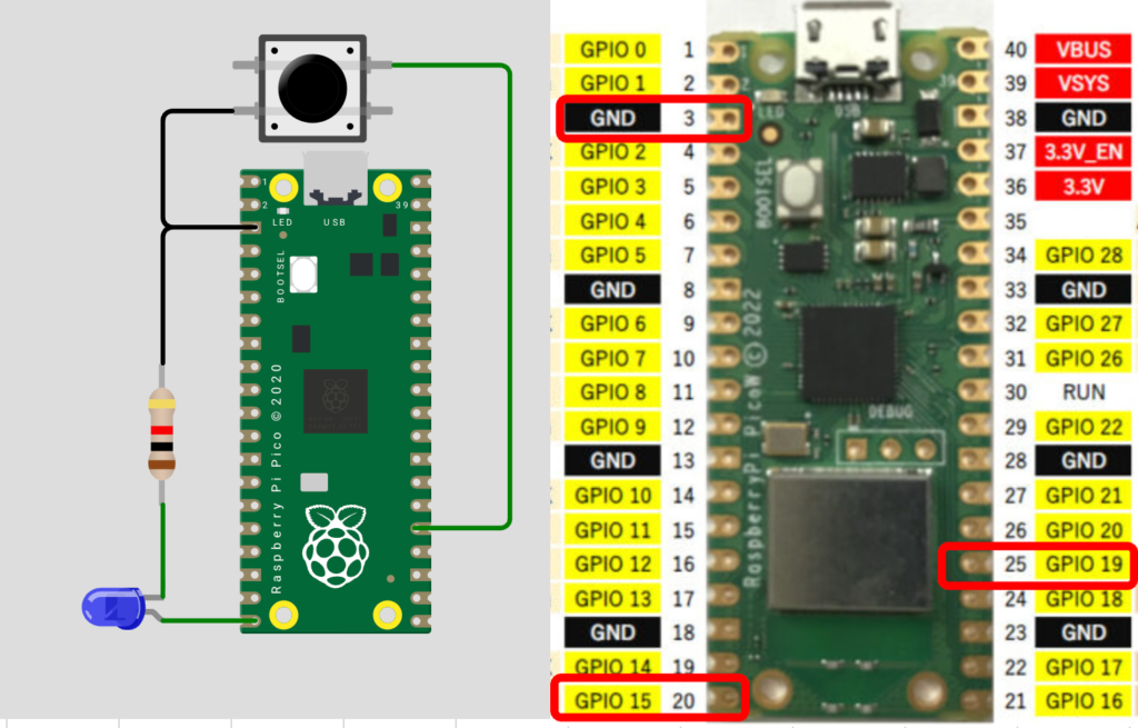 図で示すように、ボタンの片端をGPIO19(BUTTON_PIN)に接続し、もう片端をGNDに接続します。LEDはGPIO15(LED_PIN)とGNDの間に接続し、LEDの直前に抵抗(220〜330Ω)を挿入します。