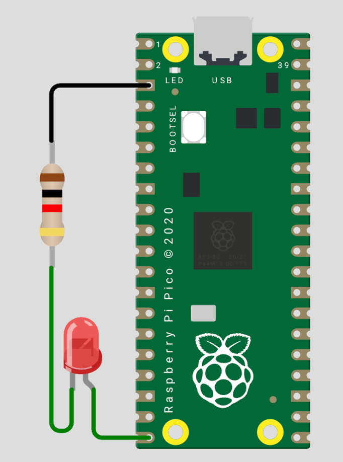 - LEDの短い足(カソード)を抵抗を通して、Picoの GND(グラウンド)端子に接続します。