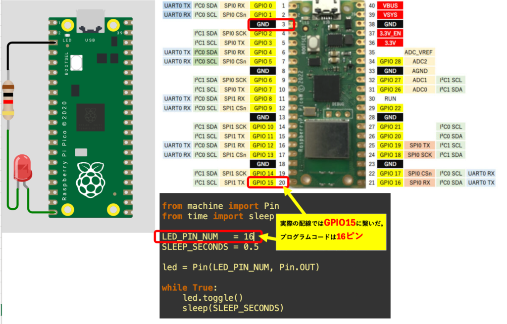 Pico / Pico W の違いを避けるため、外付けLEDを前提にします。