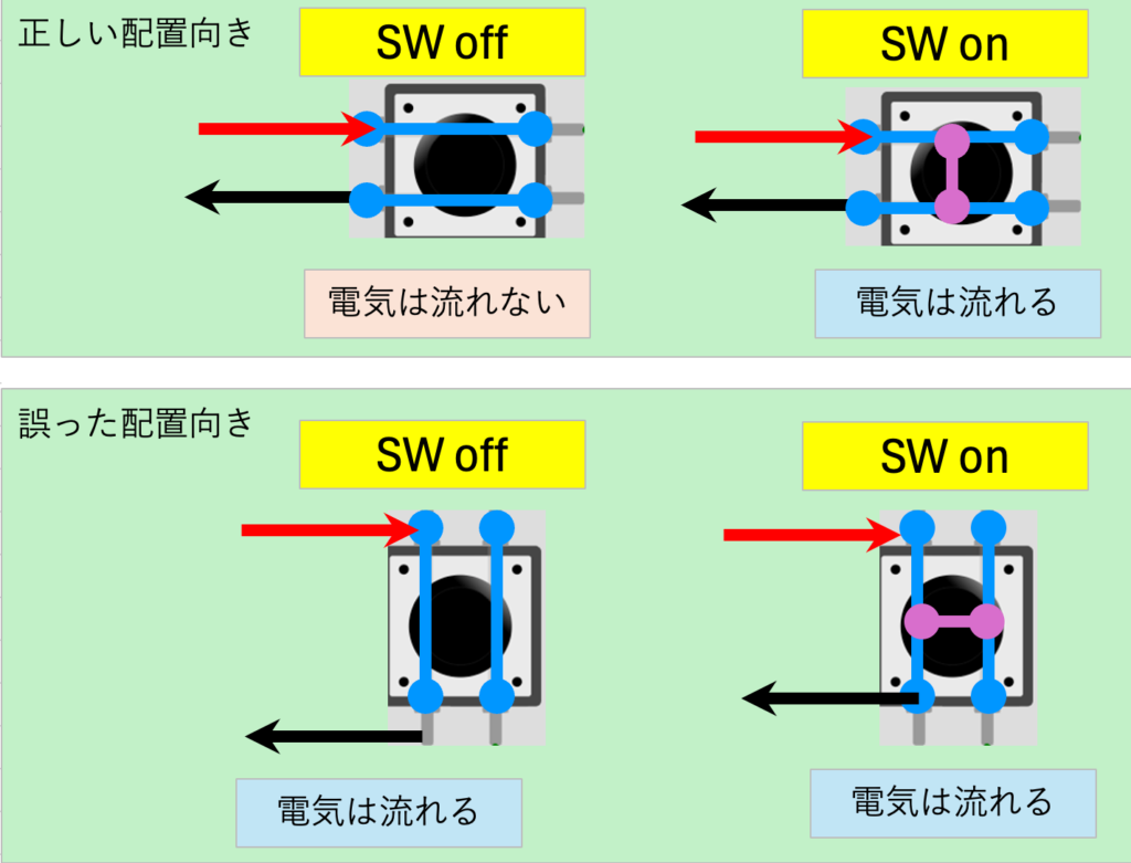 正しい向きであれば、 SWのon/offの切り替えで電流が流れる/流れないが切り替わりますが、90度向きが違うと、下図のケースだと常に電流が流れることになりSWの役割が果たせません。