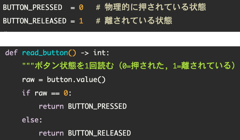 led.value(1 if button.value() == 0 else 0) # 押したらLED ON(PULL_UPなので0/1を変換)