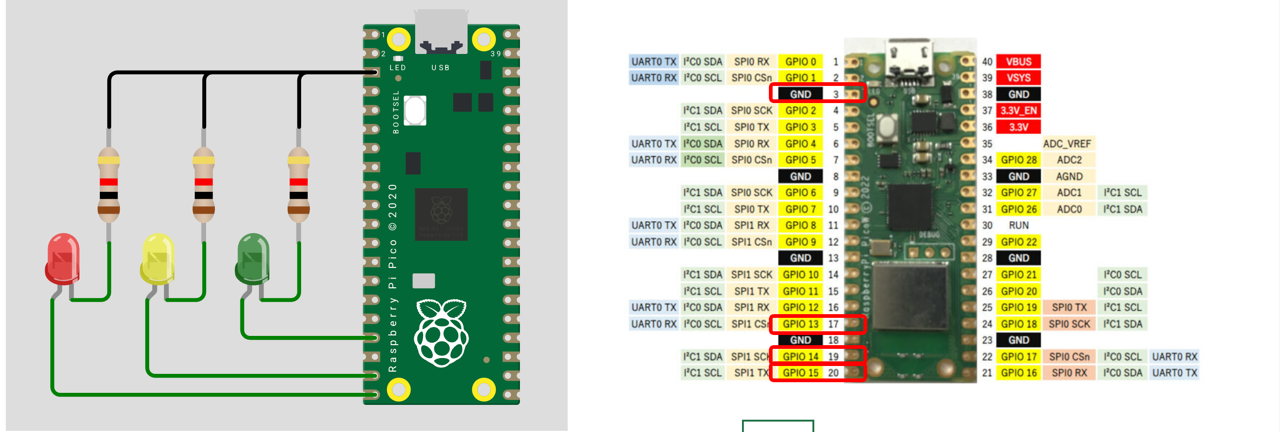 例えば、緑LEDをGPIO13番ピンへ、黄LEDをGPIO14番ピンへ、赤LEDをGPIO15番ピンへつなぐ、といった具合です。3本の抵抗はそれぞれ対応するLEDのアノード側に入れてください(。複数のLEDのカソードはブレッドボード上でまとめて一本のGNDラインに接続し、そのラインをPicoのGNDピンに接続するとスッキリします。